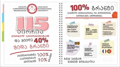 - აირჩიე კავკასიის საერთაშორისო უნივერსიტეტის საბაკალავრო პროგრამა პირველ პრიორიტეტად და მიიღე 40%-იანი შიდა გრანტი;