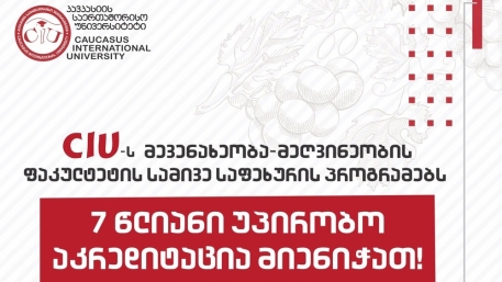 კავკასიის საერთაშორისო უნივერსიტეტის (CIU) მევენახეობა-მეღვინეობის ფაკულტეტის სამივე საფეხურის (საბაკალავრო, სამაგისტრო და სადოქტორო) პროგრამებს შვიდწლიანი უპირობო აკრედიტაცია მიენიჭა.