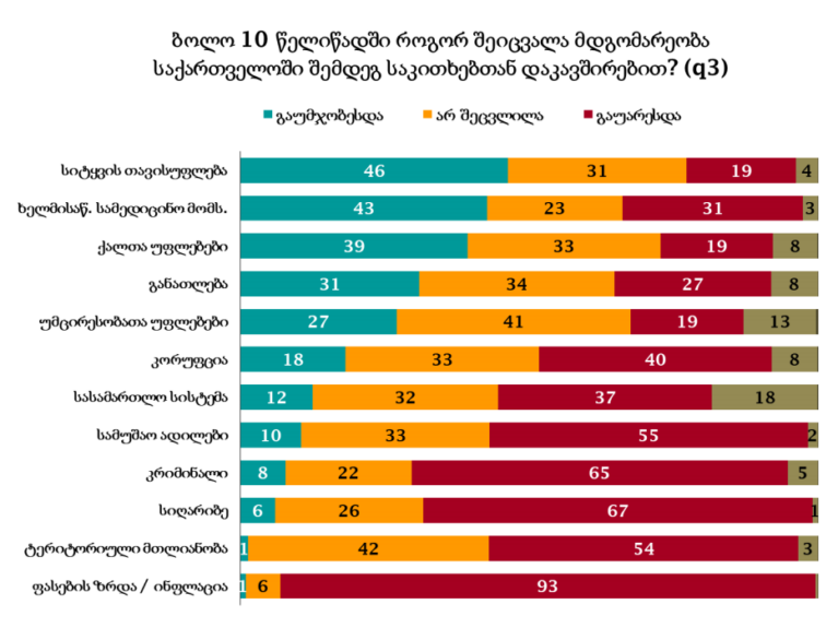 გამოკითხულთა 31 % ფიქრობს, რომ ბოლო 10 წელიწადში განათლების საკითხი ქვეყანაში გაუმჯობესდა, 34 % მიიჩნევს, რომ არ შეცვლილა, 27 %-ის აზრით განათლება ქვეყანაში გაუარესდა, ხოლო 8 %-ს კითხვაზე პასუხი არ აქვს.