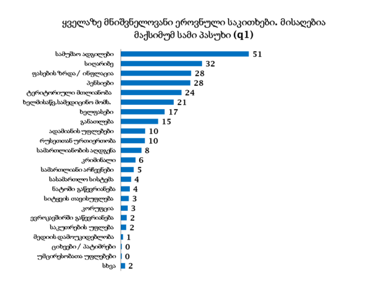 ხოლო კითხვაზე – “რომელი ეროვნული საკითხებია თქვენთვის და თქვენი ოჯახისათვის ყველაზე მნიშვნელოვანი” განათლება (25 პროცენტით) მეოთხე ადგილზეა სამუშაო ადგილების, სიღარიბისა და ტერიტორიული მთლიანობის შემდეგ.