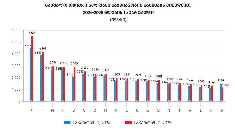 „2025 წლის I კვარტალში დაქირავებით დასაქმებულთა საშუალო თვიური ხელფასი ბიზნეს სექტორში 184.2 ლარით (9.3%) გაიზარდა და 2 169.6 ლარი შეადგინა. საქმიანობის სახეების მიხედვით ყველაზე მაღალი ხელფასი დაფიქსირდა ინფორმაციის და კომუნიკაციის (4 255.4 ლარი, წინა წლის შესაბამის პერიოდთან შედარებით გაიზარდა 4.6 პროცენტით) და პროფესიული, სამეცნიერო და ტექნიკური საქმიანობების (3 402.5 ლარი, გაიზარდა 12.1 პროცენტით) სფეროებში“, – აღნიშნულია საქსტატის მიერ გამოქვეყნებულ ანგარიშში.