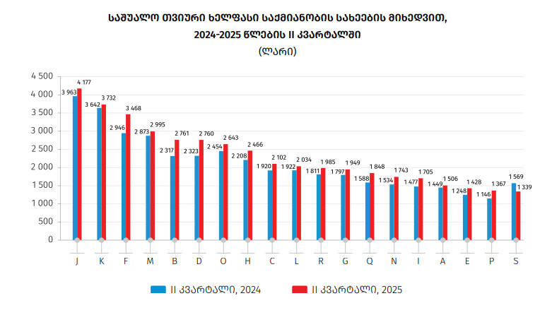 საინტერესოა საშუალო თვიური ხელფასის მაჩვენებელი სქესის მიხედვით: 2025 წლის II კვარტალში ქალების საშუალო ხელფასი 1 769.5 ლარი, ხოლო კაცების – 2 655.8 ლარი იყო. ხელფასების წლიურმა ზრდამ ქალებში 179.3 ლარი (11.3%) შეადგინა, ხოლო კაცებში – 242.3 ლარი (10.0%). საქმიანობის სახეების მიხედვით კაცების ხელფასი თითქმის ყველა სექტორში აღემატებოდა ქალების ხელფასს.