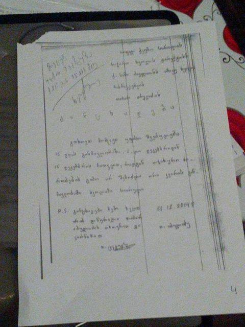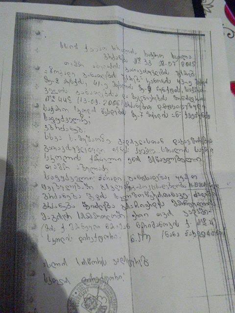 „არანაირი განცხადება უფასო შვებულების სარგებლობაზე არ დამიწერია. არც მისარგებლია. იმავე 2014 წლის დეკემბერში ავიღე ხელფასი განახევრებული ოდენობით. დავდიოდი სკოლაში, მაგრამ დირექტორი და კოლეგა მასწავლებელი თ. ტეტუნაშვილი შედიოდენ კლასებში ჩემ მაგივრად და ატარებდენ გაკვეთილებს ჩემი სკოლაში ყოფნის დროს. განცხადებაც მათვე დაწერეს და მათვე მოაწერეს ხელი. სახალხო დამცველი მეუბნება, რომ არაა უფლებამოსილი, თამარ ტეტუნაშვილის განცხადებაზე ექსპერტიზა ჩაატაროს. მე სოციალურად დაუცველს თანხა არა მაქვს საამისოდ. მე სამუშაოდან არ წავსულვარ დავდიოდი რეგულარულად, მაგრამ ვერ შევდიოდი კლასში. არ მიშვებდნენ.