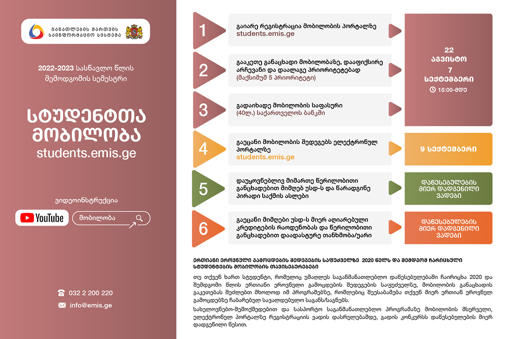 2022-223 სასწავლო წლის შემოდგომის სემესტრის მობილობისთვის რეგისტრაცია დღეს დაიწყო და 7 სექტემბრის 18:00 სთაათამდე გაგრძელდება. მობილობის მსურველმა სტუდენტებმა ელექტრონული რეგისტრაცია უნდა გაიარონ პორტალზე www.students.emis.ge