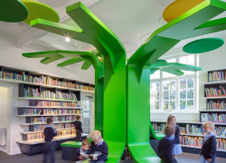 ასე გამოიყურება ბიბლიოთეკის დიზაინი, როდესაც ის სხვა ლოკაციაზე გადაიტანეს. ბიბლიოთეკის დიზაინისთვის გამოყენებულია ცოდნის კონცეფცია – ხე, რომელიც ცენტრალური ფოკუსის წერტილი გახდა.
